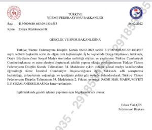 “Derya Büyükuncu’nun sosyal medya üzerinden sarf ettiği söylem ve yazılarının Türkiye Cumhuriyeti Cumhurbaşkanı’na ve eşine aleniyet oluşturacak şekilde yapmış olduğu paylaşımlarının Türkiye Yüzme Federasyonu Disiplin Kurulu Talimatı’nın 34. maddesine aykırı olduğu, ulusal medya kanallarından öğrenildiği üzere İstanbul Cumhuriyet Başsavcılığınca ilgili hakkında adli soruşturma başlatıldığı, eylemlerinin yoğunluğu ve içeriğinin şiddet göz önünde bulundurularak Türkiye Yüzme Federasyonu Disiplin Talimatının 34. maddesinin 2. fıkrası uyarınca ‘daimi hak mahrumiyetiyle cezalandırılmasına’ karar verilmiştir.”(ensonhaber)