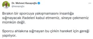Kasapoğlu, sosyal medya hesabından, Türkiye Yüzme Federasyonunca sporcu hakkında daimi hak mahrumiyeti kararı verilen belgeyi paylaşarak, “Bırakın bir sporcuya yakışmamasını insanlığa sığmayacak ifadeleri kabul etmemiz, sineye çekmemiz mümkün değil. Sporcu ahlakına sığmayan bu çirkin hareket için gereği yapılıyor.” ifadelerini kullandı.