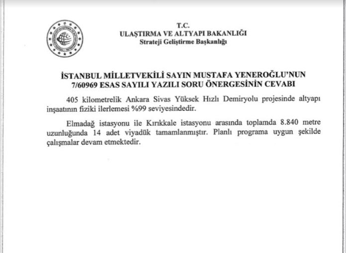 Deva Partisi Istanbul Milletvekili Mustafa Yeneroğlu’nun Sivas Ankara hızlı treni ile ilgili vermiş olduğu soru önergesine,