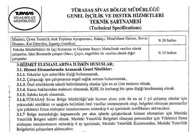13.07.2021 tarihinde saat 14:30’da TÜRASAŞ Sivas Bölge Müdürlüğü İhale Komisyonu Toplantı Salonunda yapılan “GENEL İŞÇİLİK VE DESTEK HİZMETLERİ” işi ihalesinde gün geçmiyor ki yeni bir sorun ve olayla daha karşılaşılmasın.