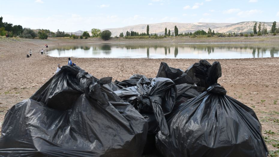 Sivas’ta gönüllü gençler kuraklıktan etkilenen gölette 100 poşet çöp topladı