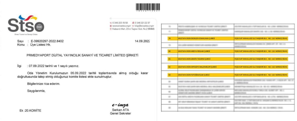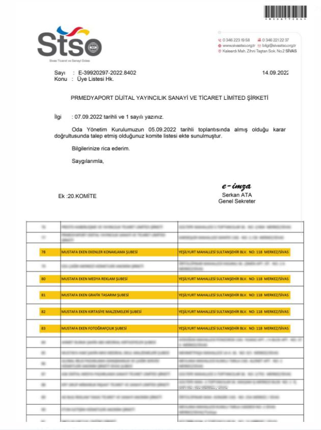Yapılan açıklama da “Şirketlerin kamuoyuna açık olan mersis kayıtları ortadadır. Önünde basın açıklaması yaptığımız özel okulun adresinde Mustafa Eken’e ait çok sayıda şirket / şube yer almaktadır. Eken açıklamasında bunu ispat ederlerde istifa edeceğim demiştir. Mersis kayıtları ortadayken bizden daha neyin ispatı istenmektedir. Ayrıca 14 Eylül’de STSO’dan 500 TL ödeyerek aldığımız liste de de özel okula ait olan adres Mustafa Eken’in şube adresleri olarak listelenmiştir. Aşağıda yayınlanan video da bu durum açıkça görülebilir. Başkan Mustafa Eken’i sözünü tutmaya ve istifaya davet ediyoruz” dedi.
